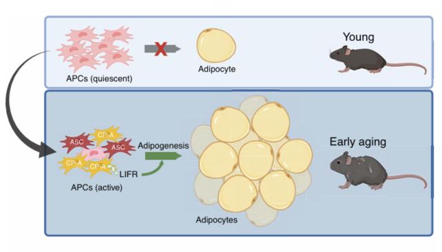 Τα βλαστοκύτταρα σε νεαρά ποντίκια (APCs) παράγουν λίπος μόνο όταν ενεργοποιούνται από στρεσογόνους παράγοντες, αλλά μερικά κύτταρα γίνονται πιο δραστήρια με την πάροδο του χρόνου (CP-As), προκαλώντας τησυσσώρευση λίπους που παρατηρείται στις κοιλιές μεσήλικων αρσενικών ποντικιών, γράφουν οι ερευνητές στη μελέτη τους που δημοσιεύθηκε στο περιοδικό «Science».