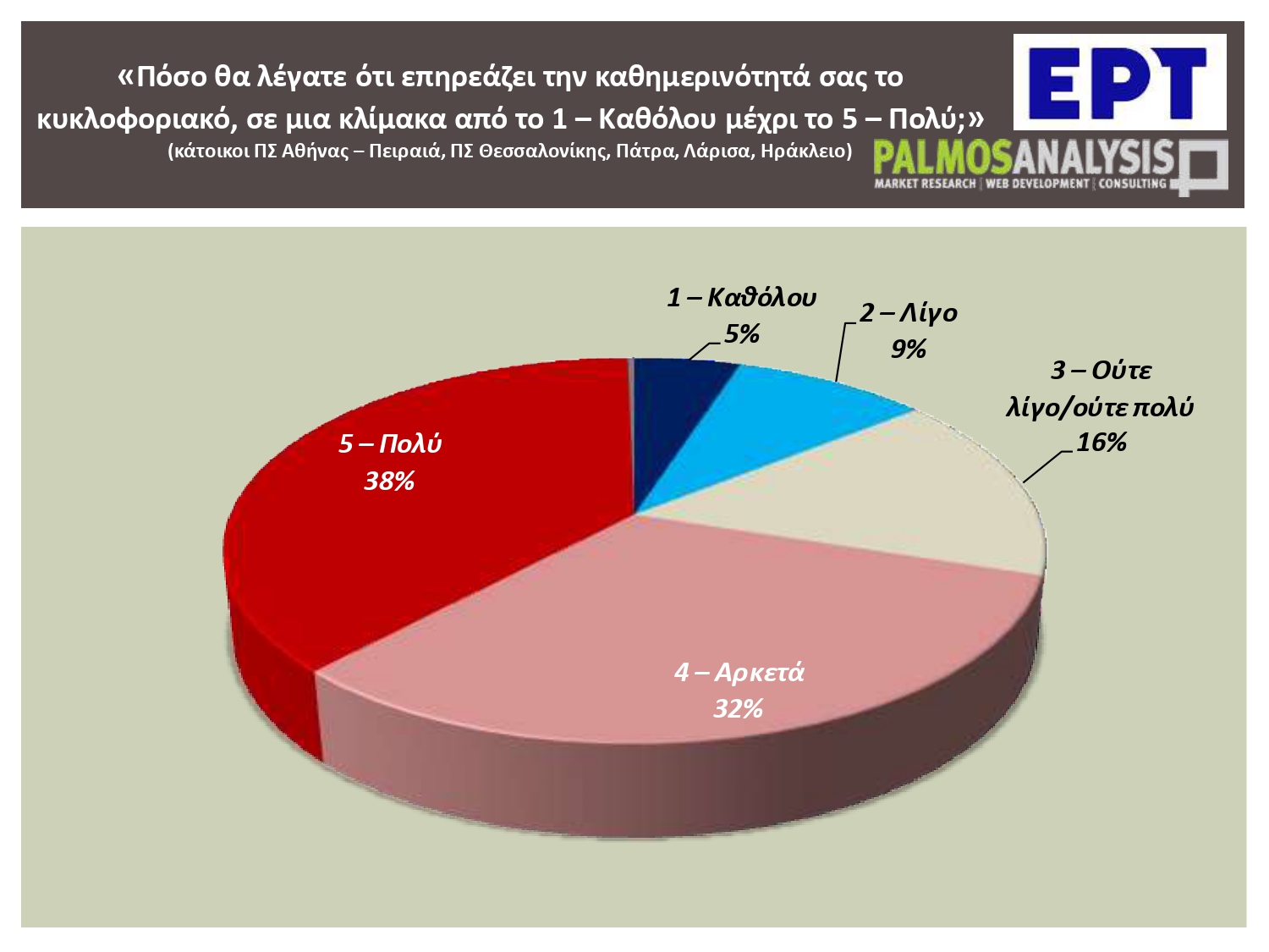 • 7 στους 10 κατοίκους των μεγάλων αστικών κέντρων της χώρας (70%) θεωρούν το κυκλοφοριακό «Πολύ» (38%) ή «Αρκετά» (32%) σημαντικό πρόβλημα για την καθημερινότητά τους. Μεγάλο πρόβλημα θεωρείται και η στάθμευση, καθώς περίπου 9 στους 10 (87%) δηλώνουν ότι το πρόβλημα της στάθμευσης στην πόλη τους είναι «Πολύ» (67%) ή «Αρκετά» (20%) σημαντικό.