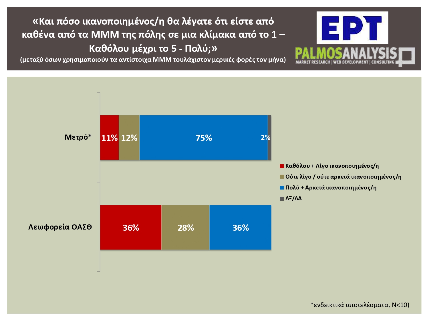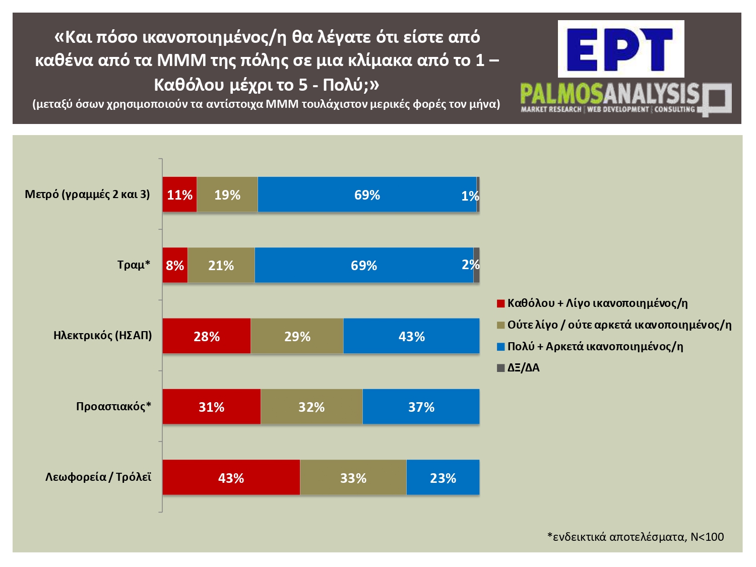• Υψηλή ικανοποίηση προκύπτει για το Μετρό, καθώς δηλώνουν «Πολύ» ή «Αρκετά» ικανοποιημένοι το 69% των χρηστών του. Θετικό ισοζύγιο ικανοποίησης προκύπτει για τον Ηλεκτρικό (ΗΣΑΠ), αλλά σε σαφώς μικρότερο βαθμό (43% «Πολύ» ή «Αρκετά» ικανοποιημένοι), ενώ οι χρήστες Λεωφορείων/Τρόλεϊ δηλώνουν «Λίγο» ή «Καθόλου» ικανοποιημένοι σε ποσοστό 43% έναντι μόλις 23% που δηλώνουν «Πολύ» ή «Αρκετά» ικανοποιημένοι.