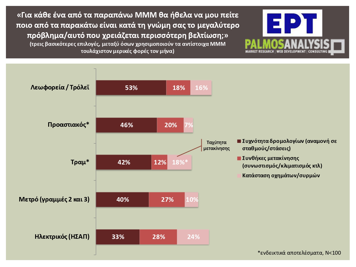 • Η αύξηση της συχνότητας των δρομολογίων και η μείωση του χρόνου αναμονής σε στάσεις/σταθμούς είναι το βασικότερο αίτημα των χρηστών όλων των ΜΜΜ (53% στους χρήστες των Λεωφορείων/Τρόλεϊ, 46% στους χρήστες του Προαστιακού, 42% στους χρήστες του Τραμ, 40% στους χρήστες του Μετρό και 33% στους χρήστες του Ηλεκτρικού (ΗΣΑΠ).