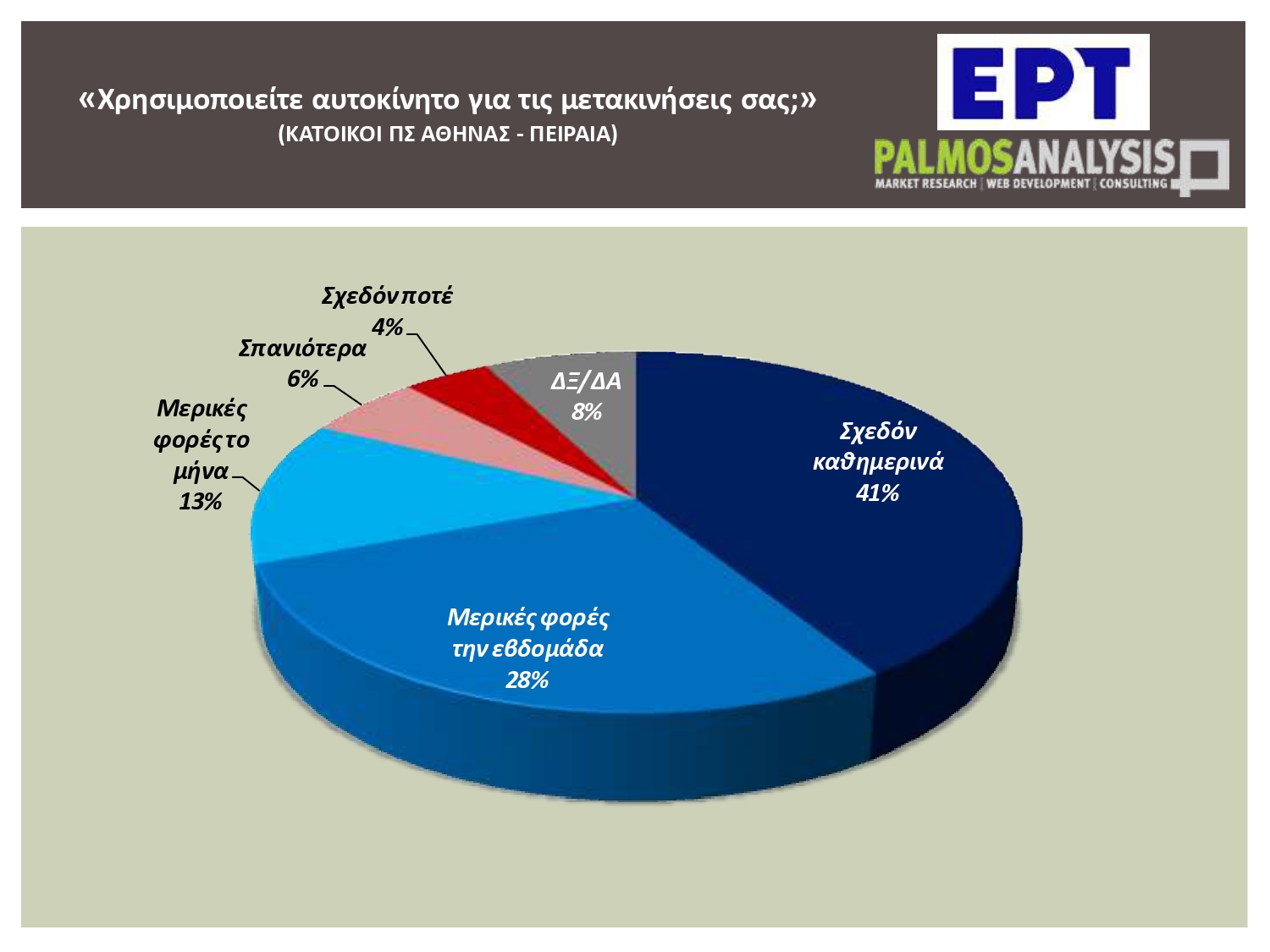 • Σχεδόν 4 στους 10 κατοίκους του ΠΣ Αθηνών – Πειραιώς (41%) χρησιμοποιούν ΙΧ αυτοκίνητο καθημερινά για τις μετακινήσεις τους.