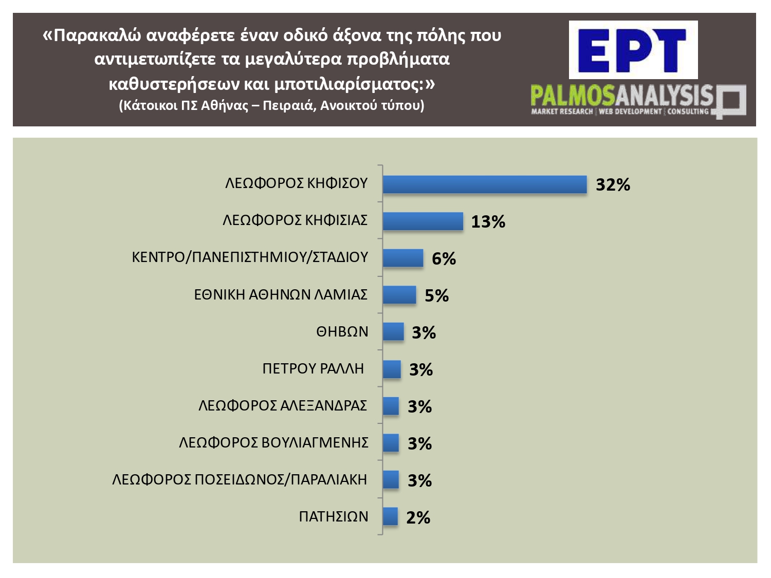 • Η λεωφόρος Κηφισού αναδεικνύεται ως ο πιο προβληματικός οδικός άξονας στην Αττική από πλευράς καθυστερήσεων και μποτιλιαρίσματος, καθώς αναφέρεται από το 32% όσων απάντησαν στο συγκεκριμένο ερώτημα.
