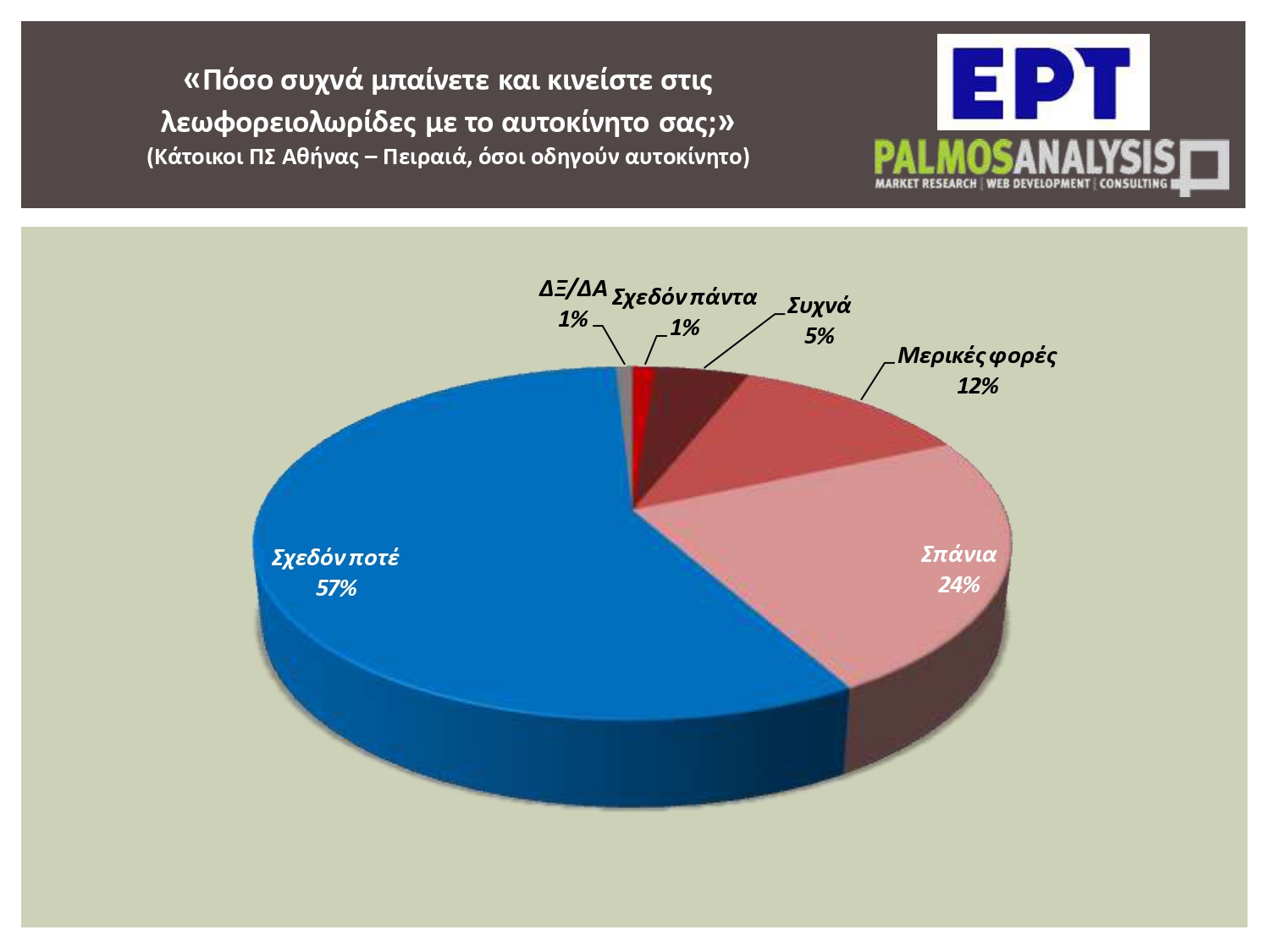 • Το 55% των κατοίκων του Πολεοδομικού Συγκροτήματος Αθηνών – Πειραιώς δηλώνουν ότι χρησιμοποιούν το Μετρό (γραμμές 2 και 3) τουλάχιστον μερικές φορές τον μήνα (14% το χρησιμοποιούν καθημερινά). Τα αντίστοιχα ποσοστά για τα λεωφορεία/τρόλεϊ είναι 47% και 16%, για τον Ηλεκτρικό (ΗΣΑΠ) 36% και 7%, για τον Προαστιακό 12% και 1% και για το Τραμ 9% και 2%.