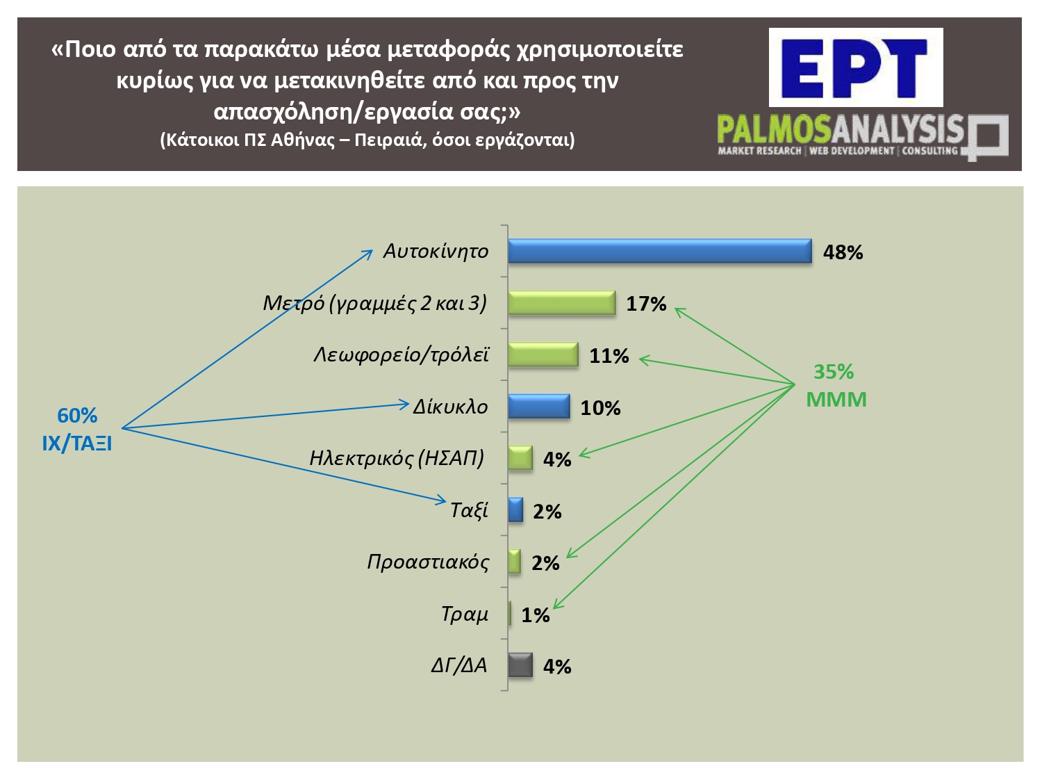 • Αθροιστικά, το 60% των εργαζομένων επιλέγουν να μετακινηθούν από και προς την εργασία τους με αυτοκίνητο ή ταξί ή δίκυκλο. Τα Μέσα Μαζικής Μεταφοράς (ΜΜΜ) επιλέγουν για την μετακίνησή τους το 35% των εργαζομένων αθροιστικά.