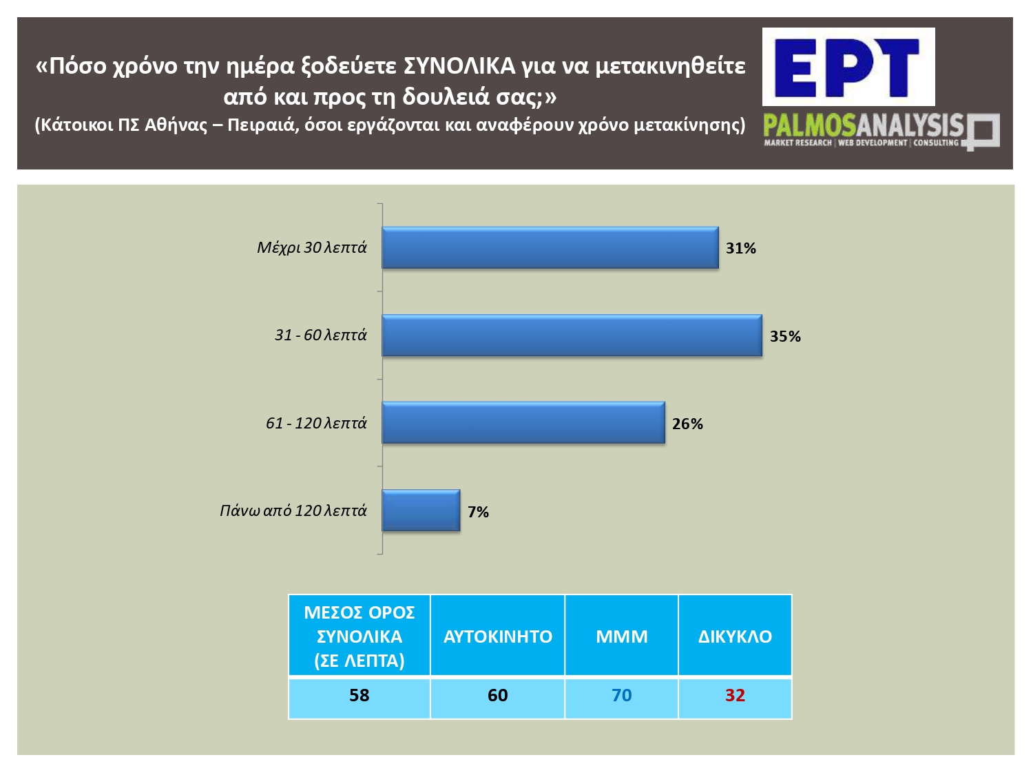 • Περίπου μία ώρα την ημέρα κατά μέσο όρο (58 λεπτά) ξοδεύουν καθημερινά οι εργαζόμενοι στο ΠΣ Αθήνας – Πειραιά για την μετακίνησή τους από και προς την εργασία τους.