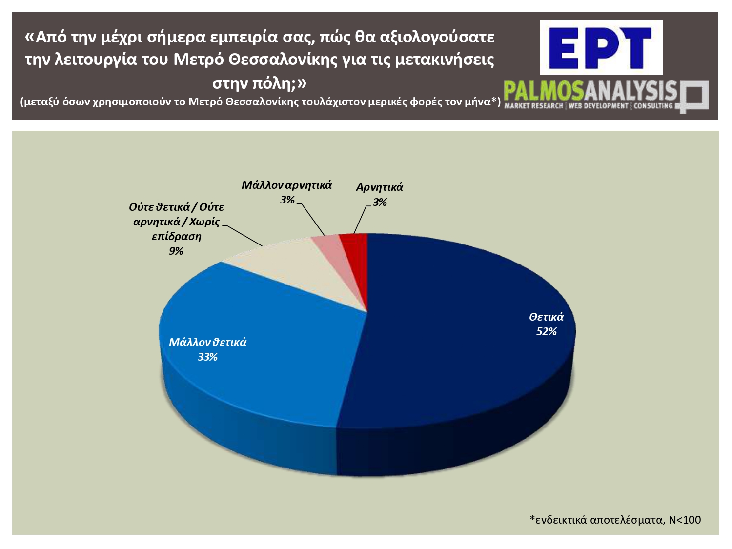 • Υψηλή ικανοποίηση προκύπτει για το Μετρό, καθώς δηλώνουν «Πολύ» ή «Αρκετά» ικανοποιημένοι το 75% όσων το χρησιμοποιούν τουλάχιστον μερικές φορές τον μήνα.  Παράλληλα, το 85% των χρηστών του Μετρό θεωρούν ότι η λειτουργία του συμβάλει «Θετικά» ή «Μάλλον θετικά» στην πραγματοποίηση των μετακινήσεών τους εντός της πόλης. Ουδέτερο ισοζύγιο ικανοποίησης προκύπτει για τους χρήστες Λεωφορείων, καθώς το 36% όσων τα χρησιμοποιούν τουλάχιστον μερικές φορές τον μήνα δηλώνουν «Πολύ» ή «Αρκετά» ικανοποιημένοι, όσοι ακριβώς δηλώνουν «Λίγο» ή «Καθόλου» ικανοποιημένοι.
