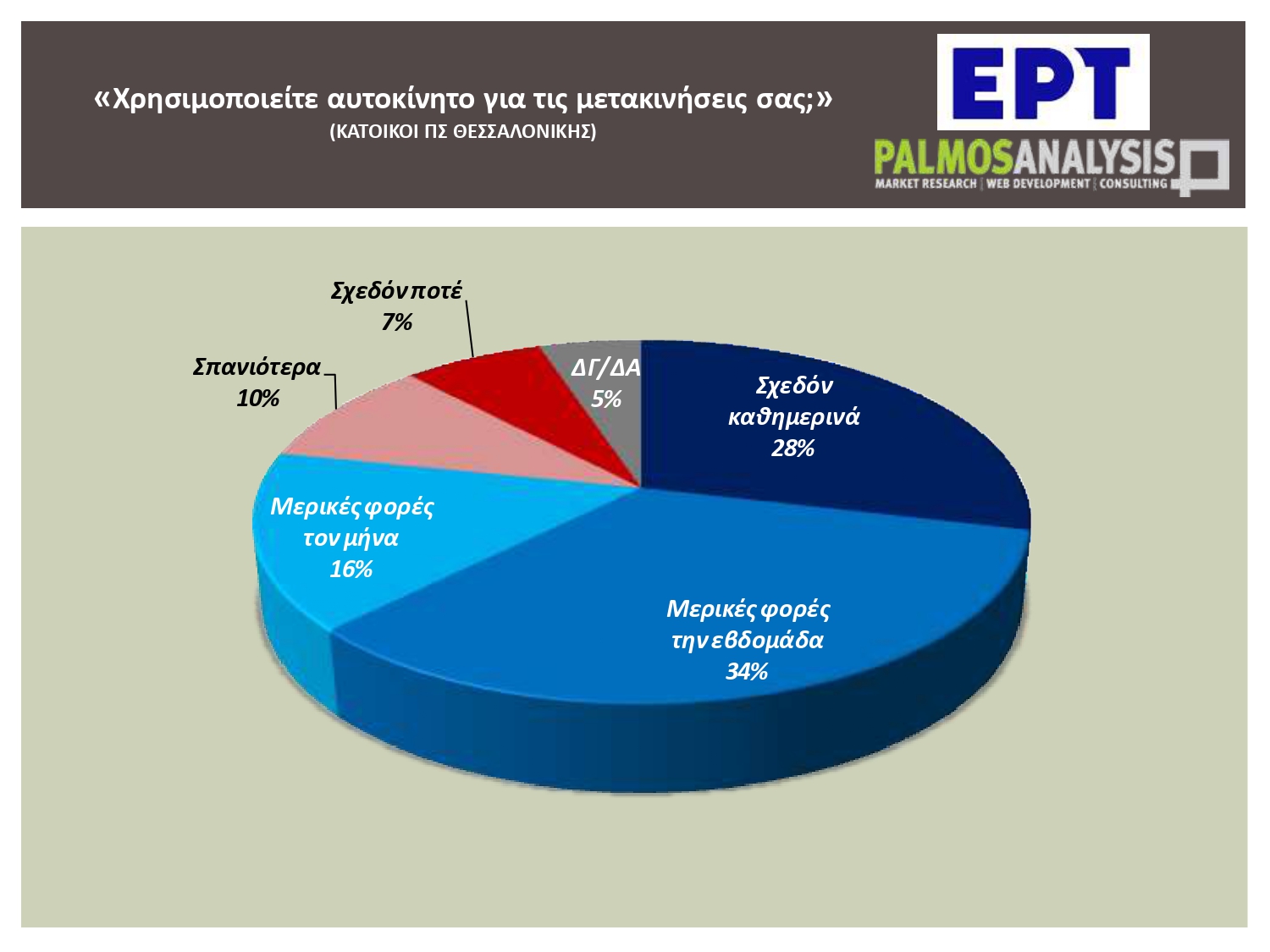 • Σχεδόν 3 στους 10 κατοίκους του ΠΣ Θεσσαλονίκης (28%) χρησιμοποιούν ΙΧ αυτοκίνητο καθημερινά για τις μετακινήσεις τους. Ο Περιφερειακός αναδεικνύεται ως ο πιο προβληματικός οδικός άξονας στην Θεσσαλονίκη, από πλευράς καθυστερήσεων και μποτιλιαρίσματος, καθώς αναφέρεται από το 30% όσων απάντησαν στο συγκεκριμένο ερώτημα.