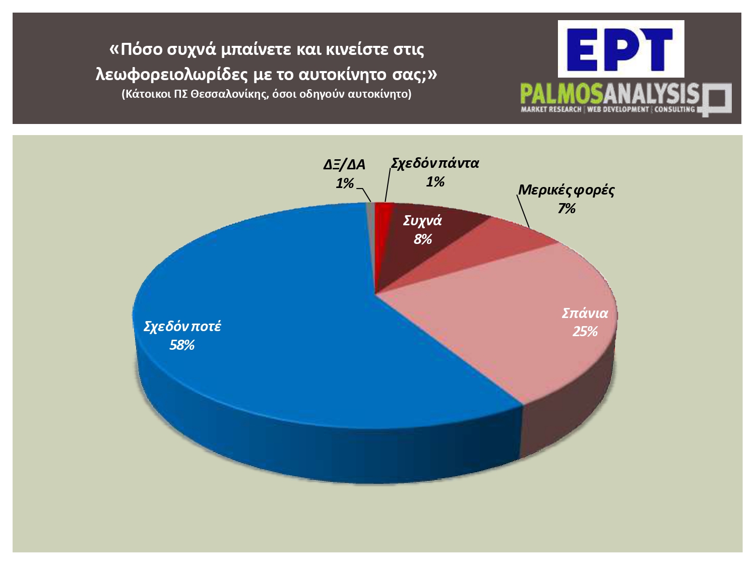 • Το 38% των κατοίκων του Πολεοδομικού Συγκροτήματος Θεσσαλονίκης δηλώνουν ότι χρησιμοποιούν το Μετρό της πόλης τουλάχιστον μερικές φορές τον μήνα και το 6% δηλώνουν ότι το χρησιμοποιούν καθημερινά. Αντίστοιχα, το 52% αναφέρουν ότι χρησιμοποιούν λεωφορεία ή τρόλεϊ τουλάχιστον μερικές φορές τον μήνα (το 13% αναφέρουν καθημερινή χρήση).