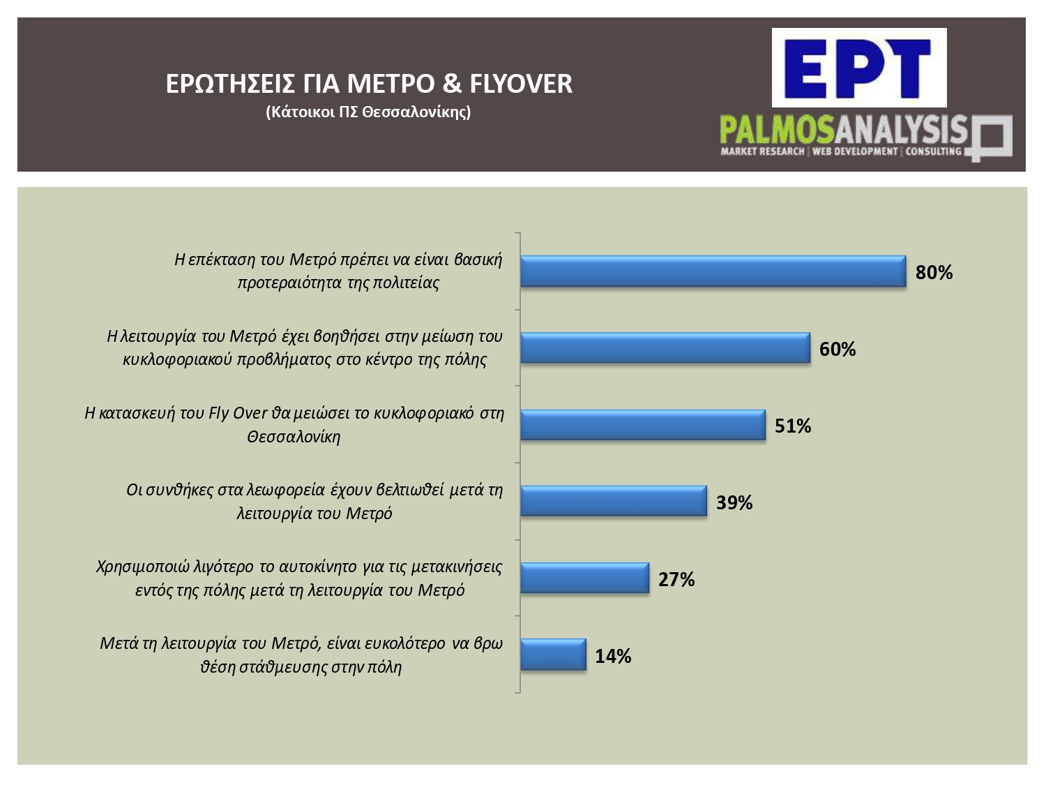 • 8 στους 10 κατοίκους του ΠΣ Θεσσαλονίκης (80%) θεωρούν ότι η επέκταση του Μετρό πρέπει να είναι βασική προτεραιότητα της Πολιτείας. Το 60% αναφέρουν ότι η λειτουργία του Μετρό έχει βοηθήσει στη μείωση του κυκλοφοριακού προβλήματος στο κέντρο της Θεσσαλονίκης.
