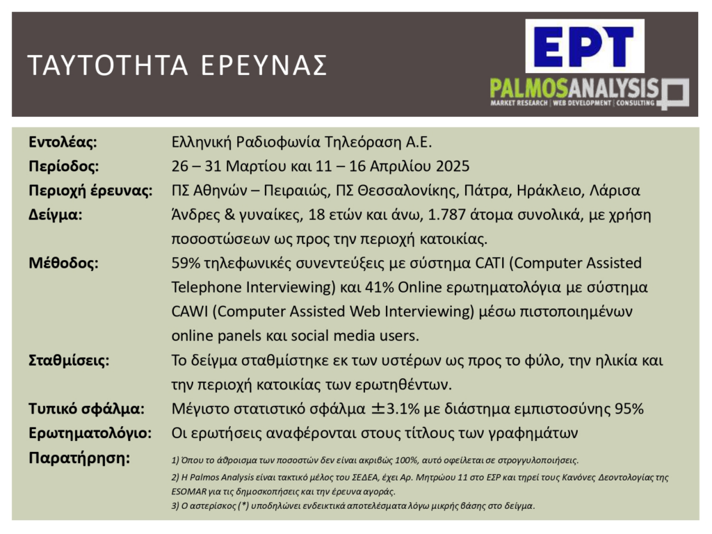 Τα σημαντικότερα ευρήματα της έρευνας, που διεξήχθη από τις 26 έως τις 31 Μαρτίου 2025 και από τις 11 έως τις 16 Απριλίου 2025 σε Αθήνα, Θεσσαλονίκη, Πάτρα, Ηράκλειο Κρήτης και Λάρισα είναι τα εξής: