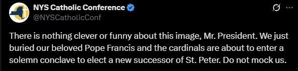 Η Καθολική Διάσκεψη της Πολιτείας της Νέας Υόρκης κατηγόρησε τον Τραμπ ότι κοροϊδεύει την πίστη. Η ανάρτηση έρχεται λίγες ημέρες αφότου αστειεύτηκε σε δημοσιογράφους, λέγοντας: «Θα ήθελα να γίνω Πάπας».