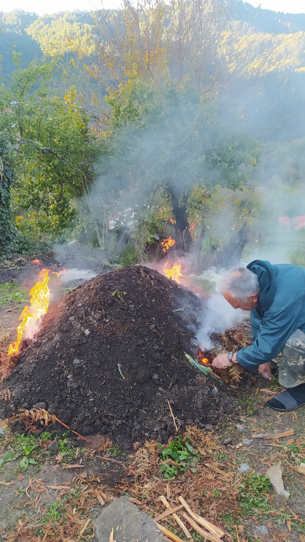 Στην συνέχεια, τα σκέπαζαν με φτέρη και στρώμα χώματος, έτσι ώστε η καύση να είναι ατελής, με ελάχιστη ποσότητα οξυγόνου και διαρκούσε 15 ημέρες. Γι’ αυτό ο κατρανάς, μέρα νύχτα έπρεπε να είναι παρών, να επιτηρεί συνεχώς τη διαδικασία της καύσης.