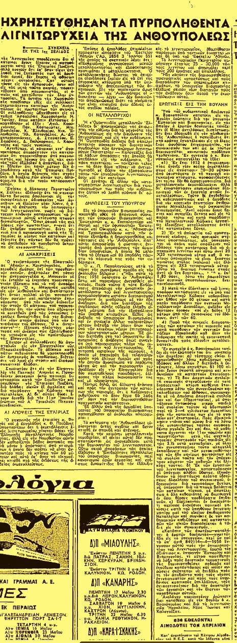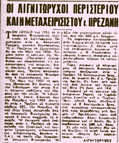 Υ.Γ. Το λιγνιτωρυχείο έκλεισε, τα «φέσια» του ιδιοκτήτη παρέμειναν και ταλαιπωρούσαν κόσμο. Δημοσίευμα της εφημερίδας ΑΥΓΗ της 1ης Ιουνίου 1961, πέντε χρόνια μετά το κλείσιμο του λιγνιτωρυχείου.