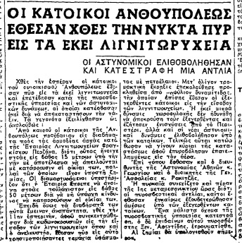 Οι φλόγες έχουν τέτοιο ύψος που είναι ορατές και σε άλλες περιοχές της Αθήνας. Η χωροφυλακή δεν μπόρεσε να τους απωθήσει και ζήτησε και ενισχύσεις που και αυτές παρά τους πυροβολισμούς στον αέρα, δεν έκαμψαν τους κατοίκους, που απάντησαν με λιθοβολισμό.