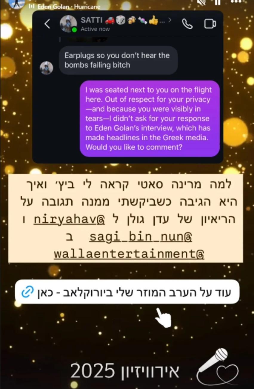 Ο Ντορνμπούς, από την πλευρά του, απάντησε στο pop icon: «Καθόμουν δίπλα σου στην πτήση προς εδώ. Από σεβασμό στην ιδιωτικότητά σου — και επειδή ήσουν εμφανώς δακρυσμένη — δεν σε ρώτησα για τη συνέντευξη της Έντεν Γκολάν, η οποία έχει γίνει πρωτοσέλιδο στα ελληνικά μέσα. Θα ήθελες να σχολιάσεις;».
