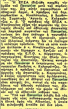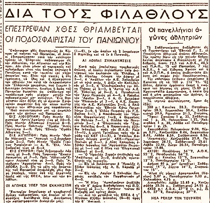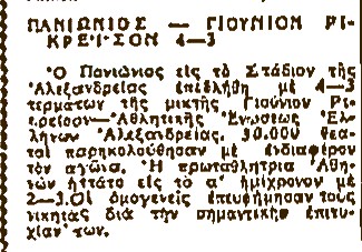 Η σύνθεση του Πανιωνίου: Μανταλόζης, Ζαρκάδης Ι. Τσουχνικάς, (Συμεωνίδης), Μάντικας, Κερδεμελίδης, (Ιωάννου), Στάικος, Κασάπογλου, Νεστορίδης, Συμεωνίδης (Πονηράκης), Σωτηριάδης, και Ν. Ζαρκάδης. Υπογραφή της ανταπόκρισης από την Κύπρο για την Αθλητική Ηχώ, Ανδρ. Πάταλης.