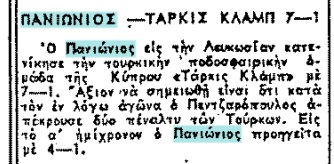 Στη Λευκωσία στις 4 Ιουνίου 1951, ο Πανιώνιος αντιμετώπισε την ομάδα της Τουρκικής Λέσχης με τελικό αποτέλεσμα 7-1 και ημίχρονο 4-1, σε έναν αγώνα όπου οι Τούρκοι για να περιορίσουν την έκταση του σκορ έπαιξαν δυνατό και σκληρό παιχνίδι. Στην ανταπόκριση αναφέρεται η μαζική παρουσία θεατών στο γήπεδο και από Ελληνοκυπρίους και από Τουρκοκυπρίους, παρά τη βροχή και το υψηλό τίμημα του εισιτηρίου.