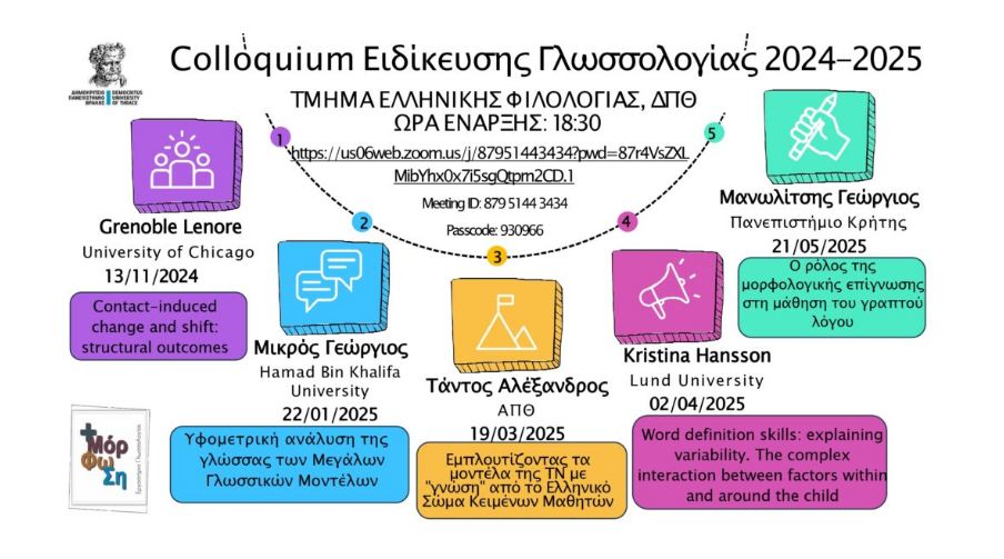 Η Ειδίκευση Γλωσσολογίας του Τμήματος Ελληνικής Φιλολογίας Κομοτηνής του Δημοκρίτειου Πανεπιστημίου Θράκης, διοργανώνει την πέμπτη και τελευταία διάλεξη του φετινού Colloquium, με προσκεκλημένο ομιλητή τον Καθηγητή Παιδαγωγικής Ψυχολογίας και Προσχολικής Ηλικίας στο Πανεπιστήμιο Κρήτης, Γεώργιο Μανωλίτση.
