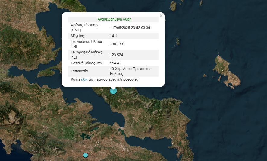 Σεισμική δόνηση μεγέθους 4,1 βαθμών της κλίμακας ρίκτερ έγινε στις 02:52, τα ξημερώματα της Κυριακής, στη βόρεια Εύβοια, με επίκεντρο 3 χιλιόμετρα ανατολικά από το Προκόπι και εστιακό βάθος 14,4 χιλιόμετρα, σύμφωνα με την αναθεωρημένη λύση.