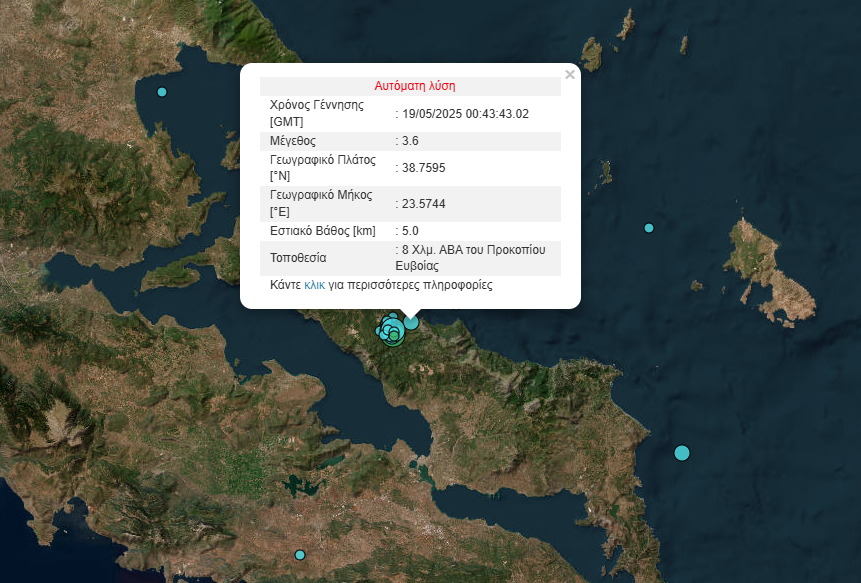 Είκοσι λεπτά αργότερα ακολούθησε νέα σεισμική δόνηση μεγέθους 3,6 της κλίμακας Ρίχτερ οκτώ χιλιόμετρα Ανατολικά-Βορειοανατολικά του Προκοπίου Ευβοίας.