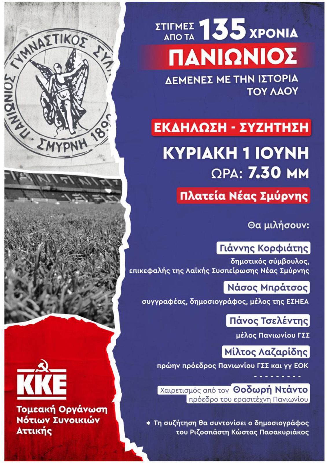 Εκδήλωση – συζήτηση με θέμα: Στιγμές από τα 135 χρόνια Πανιώνιος, δεμένες με την ιστορία του λαού, διοργανώνει η Τομεακή Οργάνωση Νότιων Συνοικιών Αττικής του ΚΚΕ, την Κυριακή 1 Ιούνη, στις 7.30 μ.μ. στην κεντρική πλατεία της Νέας Σμύρνης.