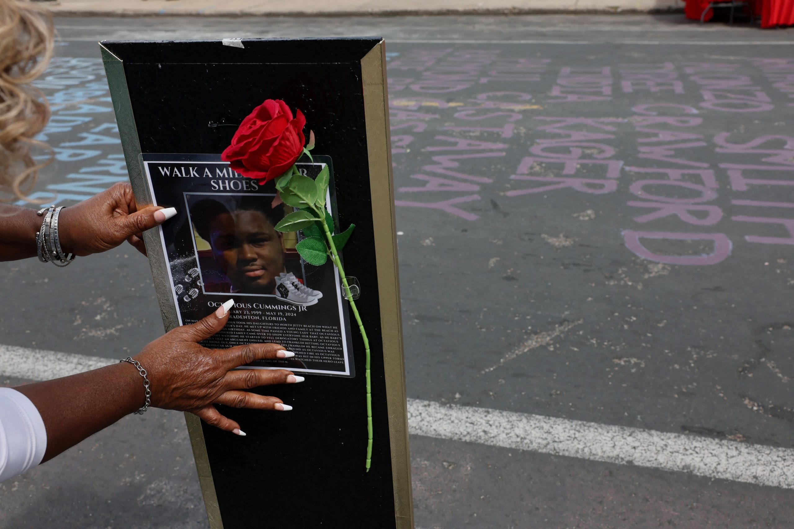 Γυναίκα τοποθετεί φωτογραφία με αφορμή την έκθεση «Walk a Mile in Their Shoes», στη μνήμη όσων έχασαν τις ζωές τους από την αστυνομική βία. REUTERS/Leah Millis