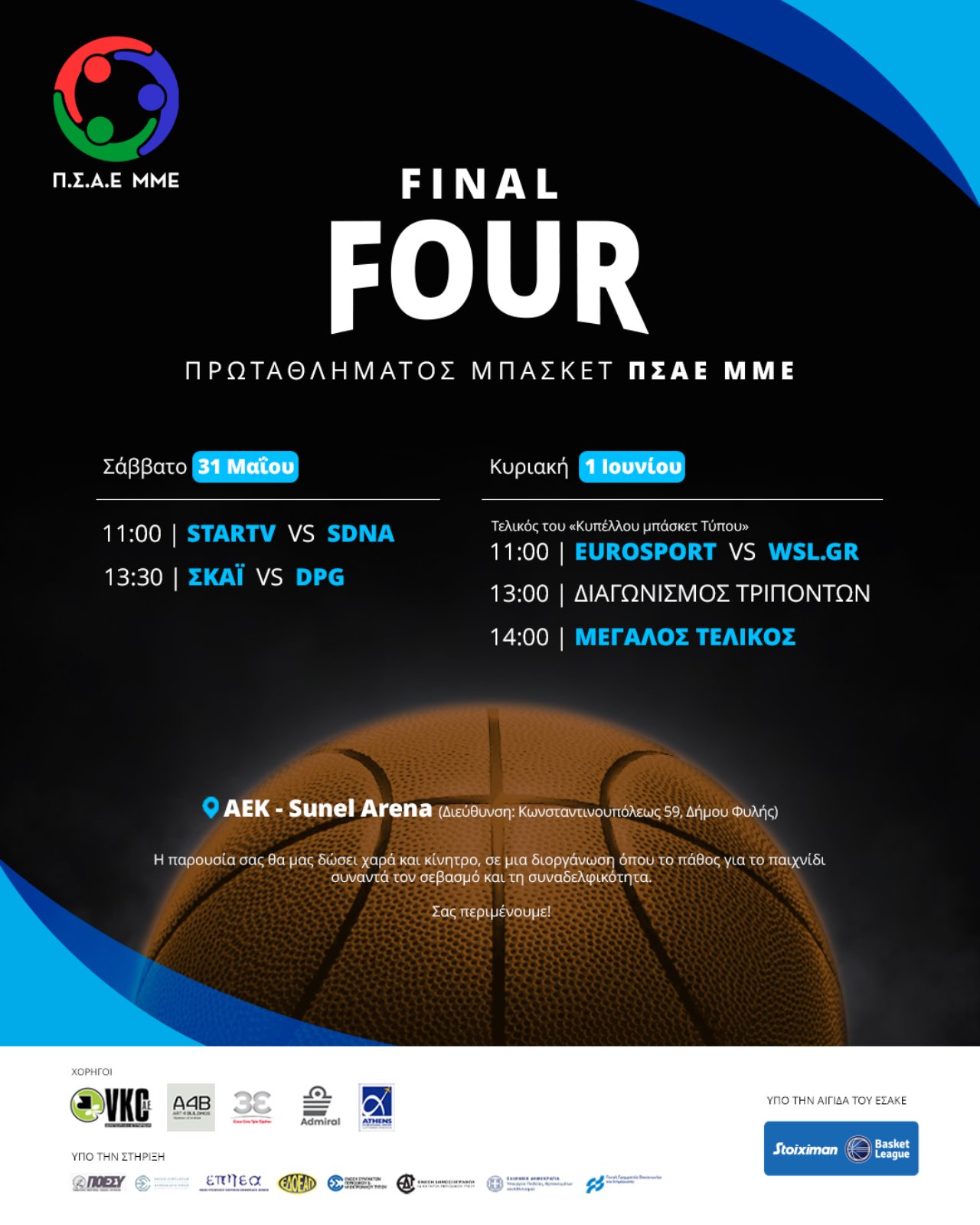 Το ερχόμενο Σαββατοκύριακο, 31 Μαΐου και 1 Ιουνίου 2025, η καρδιά του μπασκετικού ενδιαφέροντος των εργαζομένων στα Μέσα Μαζικής Ενημέρωσης χτυπά στη SUNEL Arena, το σύγχρονο «σπίτι» της ΑΕΚ, που θα φιλοξενήσει το Final-4 του Πρωταθλήματος Μπάσκετ Τύπου ΠΣΑΕ ΜΜΕ.