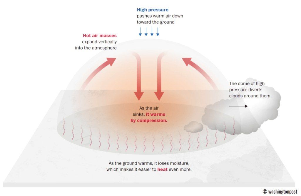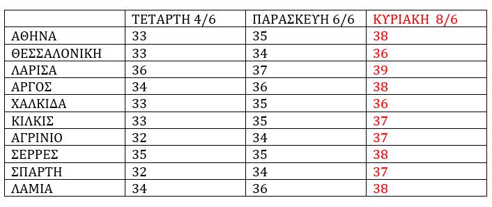 Το κύμα αυτό ζέστης αναμένεται να έχει εξάρσεις, ενώ η διάρκειά του φαίνεται να προσεγγίζει και τη δεύτερη εβδομάδα του Ιουνίου. Προσοχή στον αυξημένο κίνδυνο πυρκαγιάς! Ενδεικτικά η πορεία της θερμοκρασίας σε 10 πόλεις φαίνεται στον παρακάτω πίνακα καθώς και το φαινόμενο του «θερμικού θόλου » στις εικόνες που ακολουθούν!».