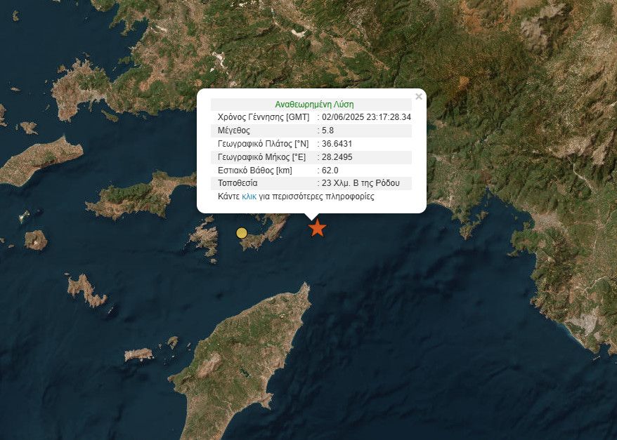 Ο ισχυρός σεισμός σημειώθηκε στις 02:17 τα ξημερώματα στο θαλάσσιο χώρο μεταξύ Ρόδου και Τουρκίας. Σύμφωνα με την Αναθεωρημένη Λύση του Γεωδυναμικού Ινστιτούτου το επίκεντρο του σεισμού εντοπίστηκε 23 χιλιόμετρα Βόρεια της Ρόδου και είχε εστιακό βάθος 62 χλμ.
