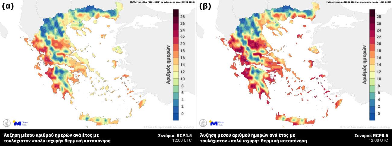 Αύξηση του μέσου αριθμού ημερών ανά έτος με τουλάχιστον «πολύ ισχυρή» θερμική καταπόνηση τις μεσημεριανές ώρες, σύμφωνα με τα σενάρια (α) RCP4.5 και (β) RCP8.5.