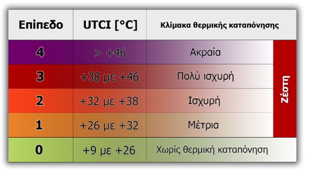 Για παράδειγμα, όταν η θερμοκρασία UTCI κυμαίνεται μεταξύ 26 °C και 32 °C, θεωρείται ότι προκαλείται «μέτρια» θερμική καταπόνηση λόγω ζέστης. Σε υψηλότερες τιμές, από 32 °C έως 38 °C, η καταπόνηση είναι «ισχυρή», ενώ μεταξύ 38 °C και 46 °C γίνεται «πολύ ισχυρή». Πάνω από τους 46 °C, η καταπόνηση είναι «ακραία» και η κατάσταση χαρακτηρίζεται ως εξαιρετικά επικίνδυνη για την υγεία.