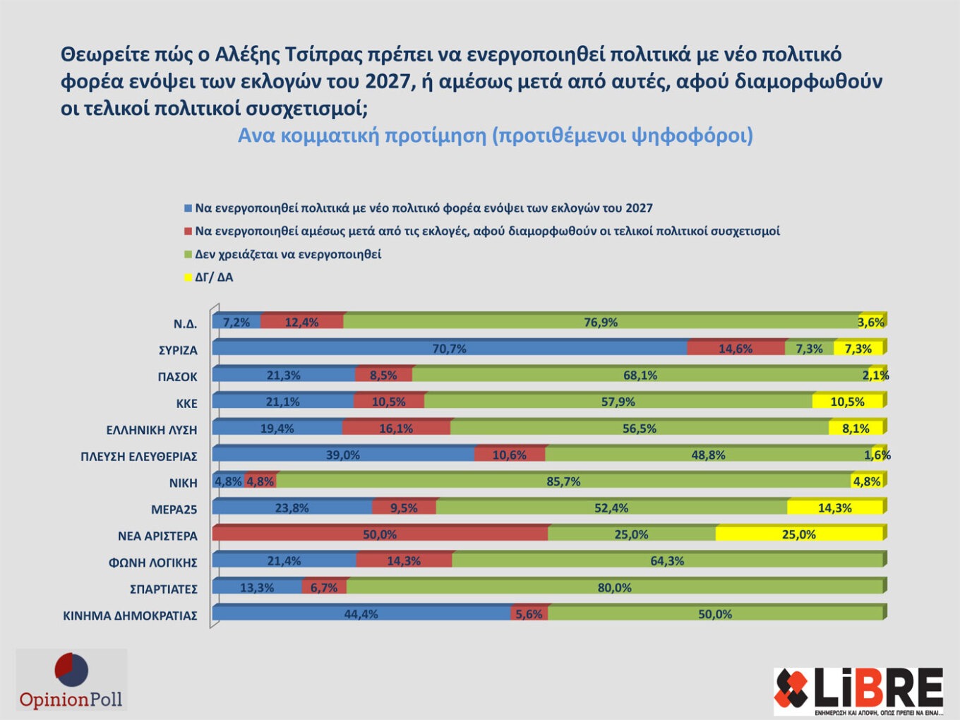 Υπέρ της ενεργοποίησης του Α. Τσίπρα πριν τις εκλογές τάσσεται το 70.7% των προτιθέμενων ψηφοφόρων του ΣΥΡΙΖΑ, το 21.3% του ΠΑΣΟΚ, το 39% της Πλεύσης Ελευθερίας. Από εκεί και πέρα το 22% δηλώνει ότι θα στήριζε ένα νέο κόμμα με ηγέτη τον Τσίπρα, με το 74.9% να κρατάει αρνητική στάση.