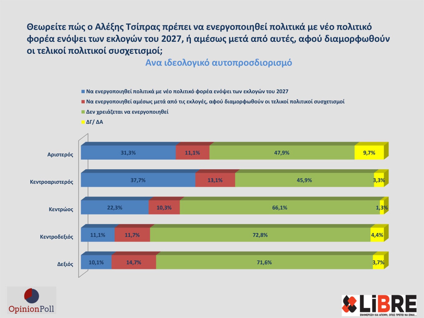 Ενδιαφέρον παρουσιάζουν και οι απαντήσεις των πολιτών για τον ενδεχόμενο ενεργοποίησης του Αλέξη Τσίπρα με ένα νέο πολιτικό φορέα. Επιπρόσθετα, η πλειοψηφία των ψηφοφόρων (με εξαίρεση εκείνους του ΣΥΡΙΖΑ) δεν πιστεύουν ότι η επιστροφή του Αλέξη Τσίπρα θα αλλάξει κάτι και επιθυμούν ένα νέο πρόσωπο να ηγηθεί αυτής της προσπάθειας.