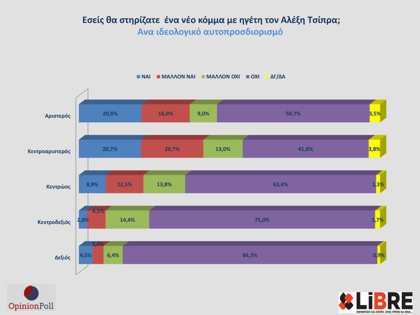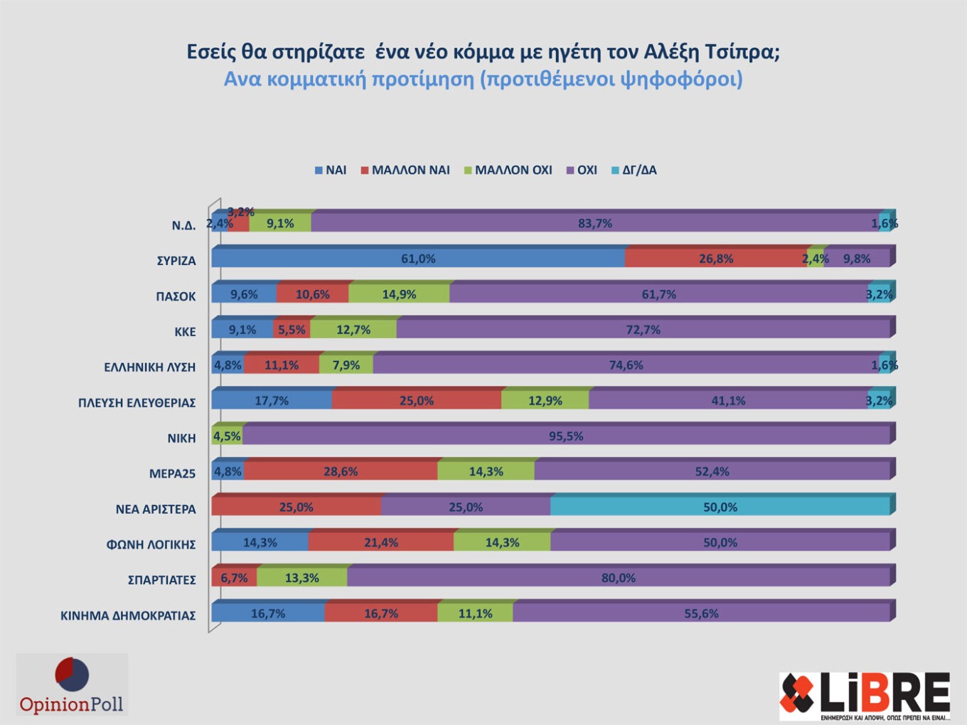 Στάση στήριξης δείχνει το 41.4% των Κεντροαριστερών και το 21. 4% των κεντρώων. Στάση στήριξης επίσης δείχνει το 87.8% των προτιθέμενων ψηφοφόρων του ΣΥΡΙΖΑ , το 20.2% του ΠΑΣΟΚ, το 42.7% της Πλεύσης Ελευθερίας ενός νέου κόμματος Τσίπρα.