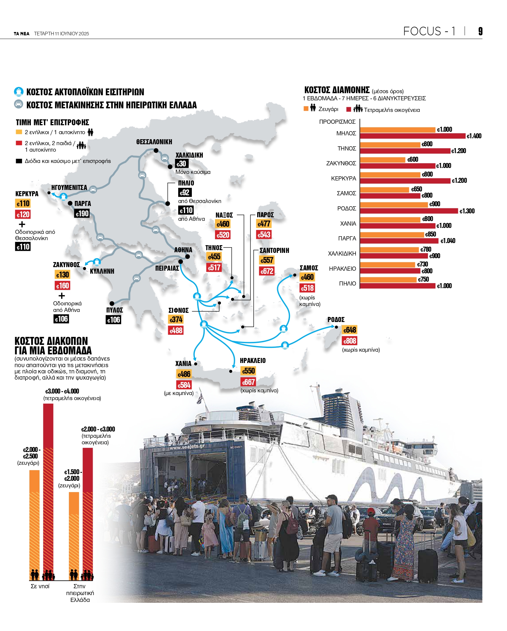 Ενδεικτικά, για να ταξιδέψει ένα ζευγάρι με αυτοκίνητο στις Κυκλάδες, πρέπει να έχει να διαθέσει από 455 έως 557 ευρώ κατά μέσο όρο ή πάνω από 250 ευρώ ανά άτομο. Επομένως, για μια 4μελή οικογένεια με αυτοκίνητο το κόστος διαμορφώνεται από 488 ως 672 ευρώ, ήτοι κάπου 290 ευρώ ανά άτομο. Για την Κρήτη, επίσης, ένα ζευγάρι με αυτοκίνητο πρέπει να διαθέσει από 486 ως και 550 ευρώ κατά μέσο όρο ή 259 ευρώ ανά άτομο για τα ακτοπλοϊκά του, ενώ η τετραμελής οικογένεια από 584 ως 667 ευρώ κατά μέσο όρο.