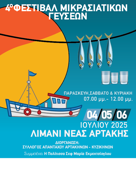 Το 4ο Φεστιβάλ Μικρασιατικών Γεύσεων ανοίγει τις πόρτες του στη Νέα Αρτάκη και μας προσκαλεί σε ένα μοναδικό ταξίδι μνήμης, παράδοσης και αυθεντικής γαστρονομίας! Θα το διοργανώσει και φέτος ο Σύλλογος Απανταχού Αρτακηνών-Κυζικηνών, στις 4, 5 και 6 Ιουλίου στο λιμάνι της πόλης.