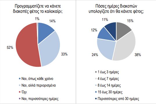 Σύμφωνα με τα αποτελέσματα, η πλειονότητα των ερωτηθέντων (52%) δεν προγραμματίζει να κάνει διακοπές το καλοκαίρι του 2025, γεγονός που ενδέχεται να αντικατοπτρίζει είτε οικονομικές πιέσεις, είτε άλλους προσωπικούς περιορισμούς. Ωστόσο, το 48% σκοπεύει να κάνει διακοπές, το 33% έστω και περιορισμένες, το 14% δηλώνει πως θα ταξιδέψει όπως κάθε χρόνο και 1% περισσότερες ημέρες. Από όσους σχεδιάζουν διακοπές, οι περισσότεροι (38%) υπολογίζουν να απουσιάσουν για 8 έως 14 ημέρες, ενώ 24% για 4 έως 7 ημέρες. Ο μέσος χρόνος διακοπών για όσους τελικά ταξιδέψουν διαμορφώνεται στις 11,3 ημέρες, στοιχείο που επιβεβαιώνει την τάση για συγκρατημένες αποδράσεις.