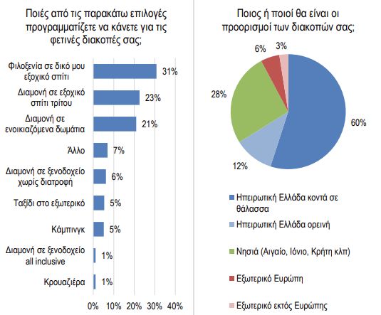 Η πλειοψηφία του κοινού επιλέγει τις εξοχικές κατοικίες, είτε φιλοξενία (31%), είτε διαμονή (23%). Το 21% επιλέγει διαμονή σε ενοικιαζόμενα δωμάτια και μόνο το 7% διαμονή σε ξενοδοχεία (6% χωρίς διατροφή και 1% με πλήρη διατροφή), κάτι που αποτελεί ένδειξη για την δυνατότητα οικονομικής ανταπόκρισης των ελληνικών νοικοκυριών στις εναλλακτικές που υπάρχουν. Τέλος το 5% επιλέγει camping και το 5% επιλέγει ταξίδι στο εξωτερικό. Σε γενικές γραμμές καταγράφεται μία πρόθεση του ελληνικού κοινού για οικονομικότερες λύσεις διακοπών προκειμένου να εξοικονομήσει χρήματα για να μπορέσει να πραγματοποιήσει κάποιο ταξίδι, είτε για να μπορέσει να επεκτείνει τη χρονική διάρκεια του. Οι πιο κοστοβόρες επιλογές, όπως τα ξενοδοχεία all inclusive και οι κρουαζιέρες, συγκεντρώνουν εξαιρετικά χαμηλά ποσοστά. Όσον αφορά τους προορισμούς, η ηπειρωτική Ελλάδα κοντά σε παραθαλάσσιες περιοχές συγκεντρώνει την πλειοψηφία (60%), ενώ ακολουθούν τα νησιά (28%). Η ορεινή ηπειρωτική χώρα αποτελεί επιλογή για το 12% των ταξιδιωτών, ενώ το 9% εξετάζει διακοπές στο εξωτερικό. Τα ευρήματα υποδεικνύουν μια ξεκάθαρη στροφή προς εγχώριους και πιο προσιτούς προορισμούς και την αποφυγή των ακτοπλοϊκών εισιτηρίων.