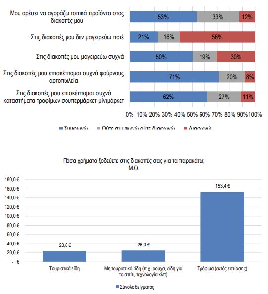 Η τάση αυτή εκφράζεται μέσα από τη συστηματική προετοιμασία γευμάτων στον χώρο διαμονής, την αποφυγή εξόδων για εστίαση και την εντατική αγορά τροφίμων από σούπερ μάρκετ, φούρνους, οπωροπωλεία και άλλες τοπικές επιχειρήσεις. Παρά τον περιορισμό στις συνολικές δαπάνες, η ενίσχυση των μικρών, τοπικών αγορών αναδεικνύεται σε έμμεσο αλλά ουσιαστικό θετικό αποτέλεσμα, δημιουργώντας έναν κύκλο ευρύτερης οικονομικής στήριξης των τοπικών κοινοτήτων στις τουριστικές περιοχές.
