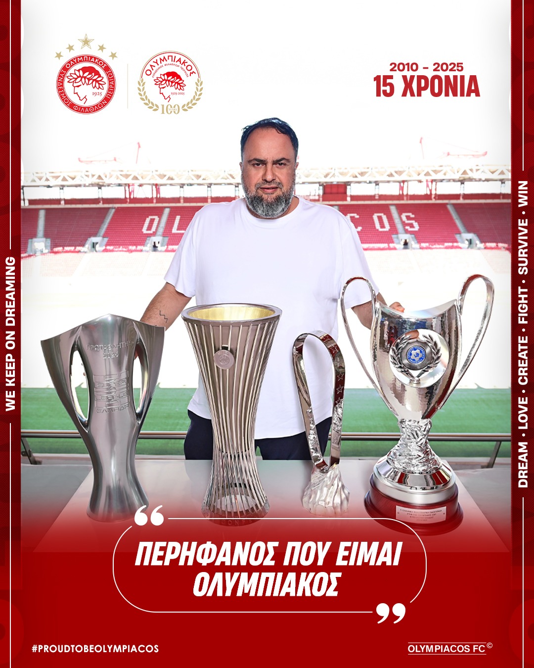 “15 χρόνια με 11 πρωταθλήματα Ελλάδας, 5 κύπελλα Ελλάδας και τα πρώτα 2 ευρωπαϊκά μας τρόπαια! Συνεχής στήριξη στον Ερασιτέχνη Ολυμπιακό ο οποίος μετράει 215 τίτλους στα κύρια ομαδικά Ολυμπιακά αθλήματα ανδρών και γυναικών σε Ελλάδα και Ευρώπη!