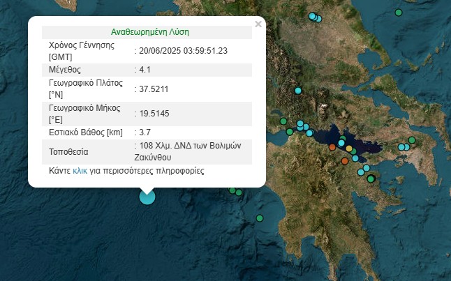 Σύμφωνα με το Γεωδυναμικό Ινστιτούτο του Εθνικού Αστεροσκοπείου Αθηνών, το επίκεντρο της δόνησης εντοπίζεται στον θαλάσσιο χώρο 108 χλμ. δυτικά-νοτιοδυτικά των Βολιμών Ζακύνθου.