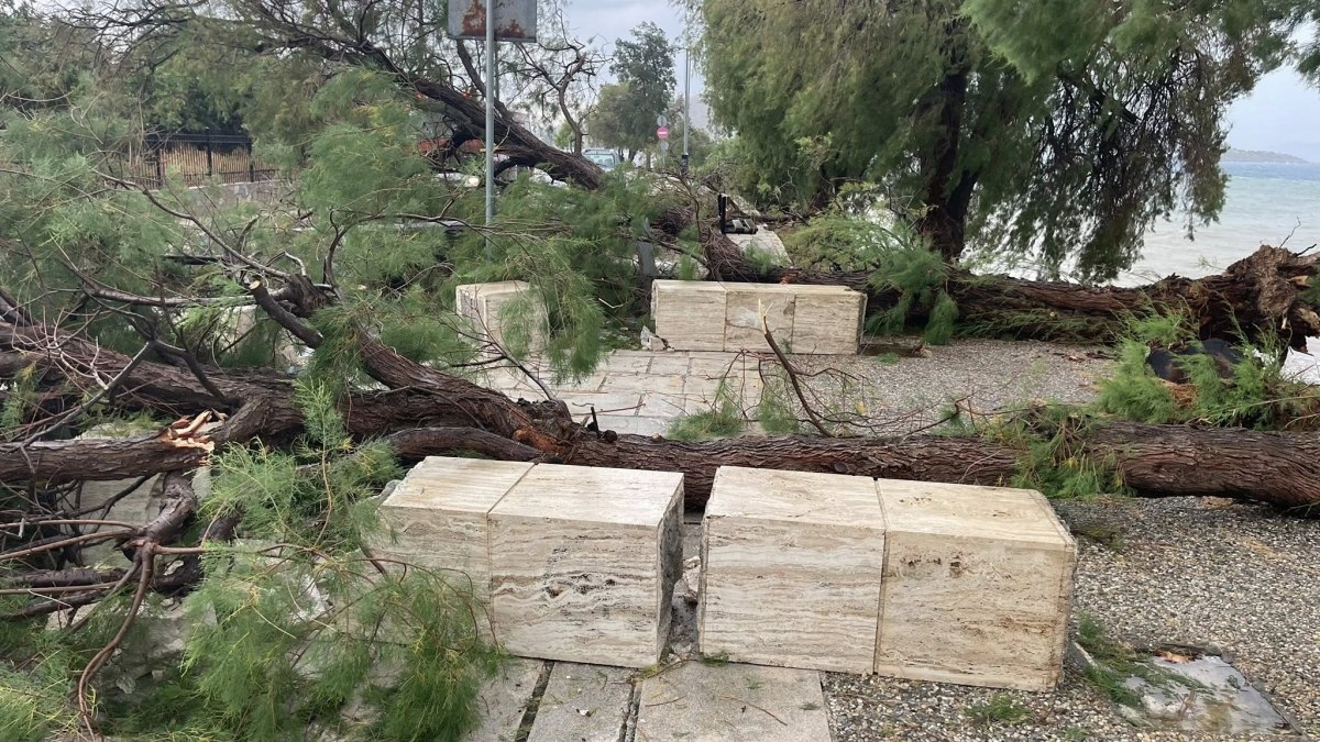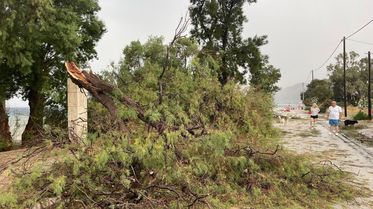 Όπως φαίνεται και στις εικόνες ο δρόμος μπροστά στην παραλία έχει κλείσει από τα πεσμένα δέντρα.