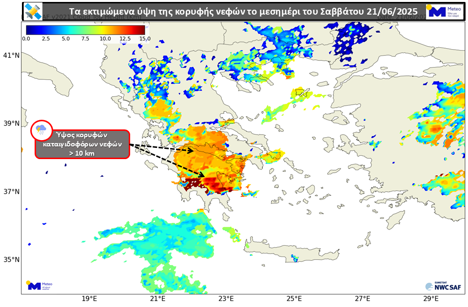 Οι ισχυρές καταιγίδες αποτυπώθηκαν από τον Ευρωπαϊκό Μετεωρολογικό Δορυφόρο Meteosat-10, που μετά από επεξεργασία με εξειδικευμένους αλγορίθμους που πραγματοποίησε το Εθνικό Αστεροσκοπείο Αθηνών / Meteo.gr, υπολογίστηκε ότι τα ύψη των καταιγιδοφόρων νεφών ξεπέρασαν τα 10 km.