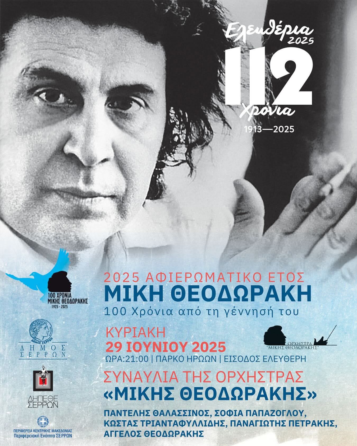 Με μια μεγάλη συναυλία αφιερωμένη στον κορυφαίο Έλληνα συνθέτη Μίκη Θεοδωράκη, η οποία θα πραγματοποιηθεί την Κυριακή 29 Ιουνίου στις 21:00 στο ιστορικό Πάρκο Ηρώων θα κορυφωθούν οι επετειακές εκδηλώσεις του Δήμου Σερρών για τα 112 χρόνια από την Απελευθέρωση της πόλης.