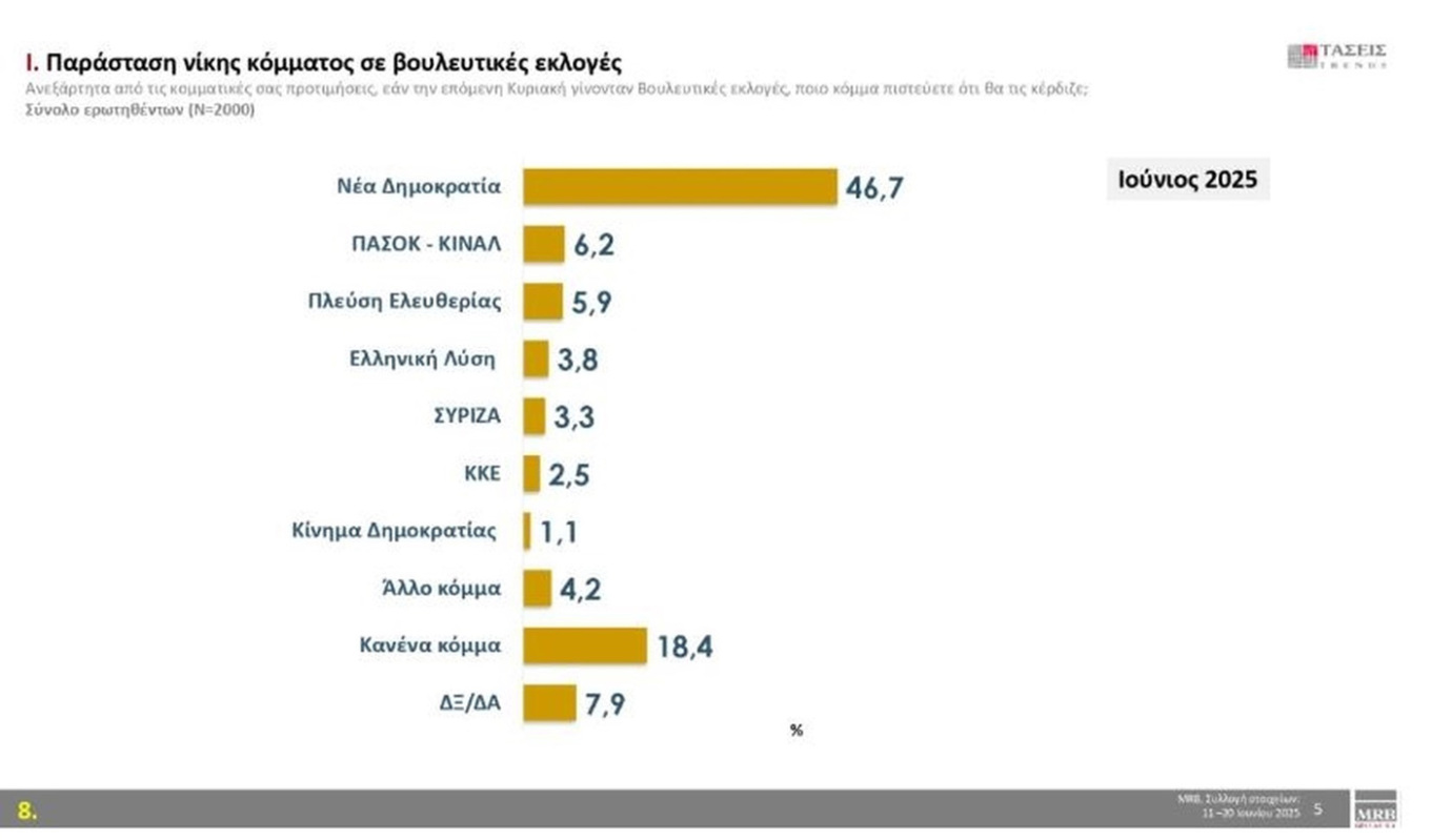 MRB: Στο 30,2% η ΝΔ, δεύτερο το ΠΑΣΟΚ – Πέφτει η Πλεύση Ελευθερίας