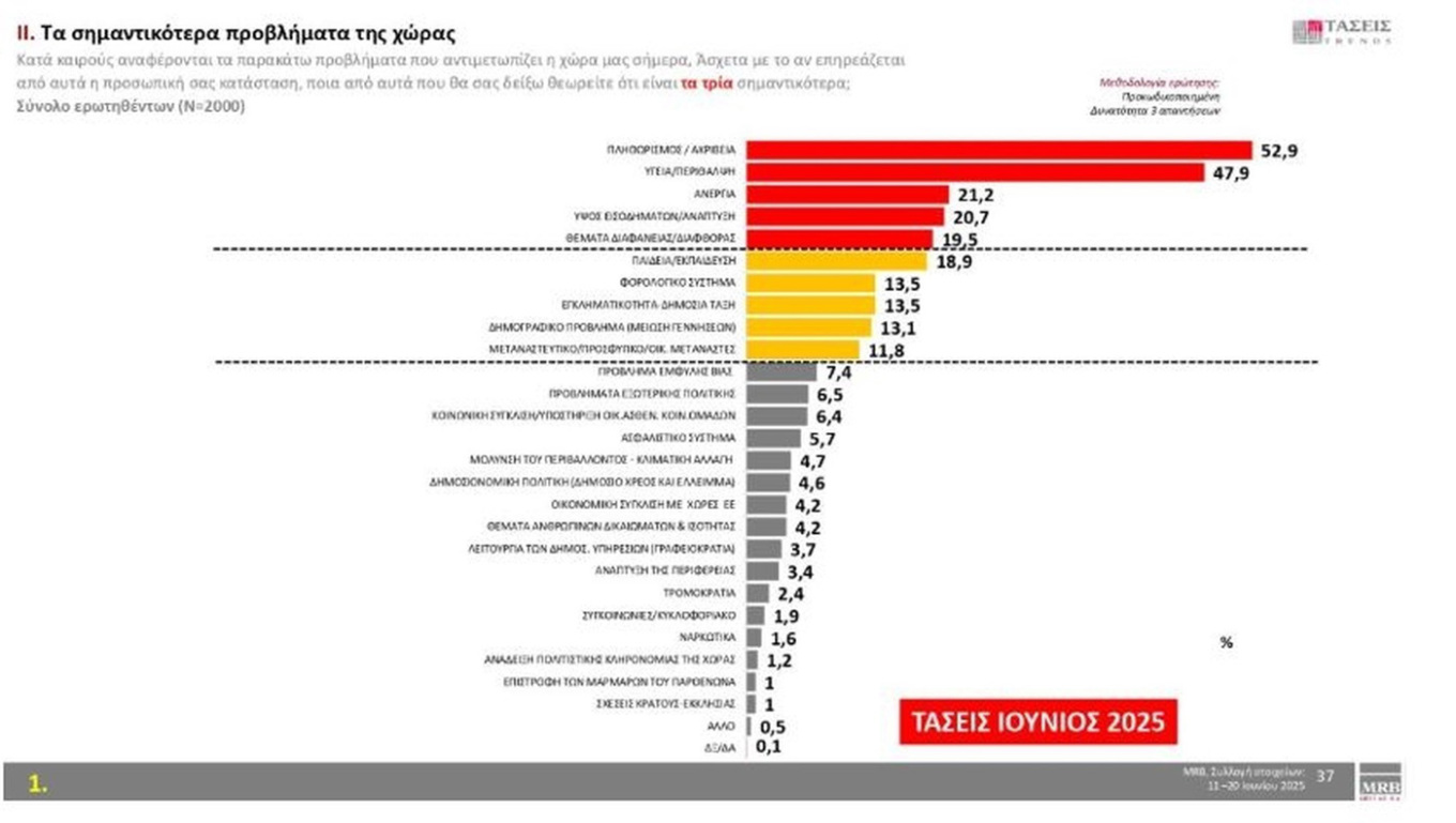 Στα σημαντικότερα προβλήματα της χώρας η ακρίβεια έχει ποσοστό 52,9%, η υγεία με 47,9%, η ανεργία με 21,2%, το ύψος εισοδημάτων με 20,7% και τα θέματα διαφάνειας/διαφθοράς με 19,5%.