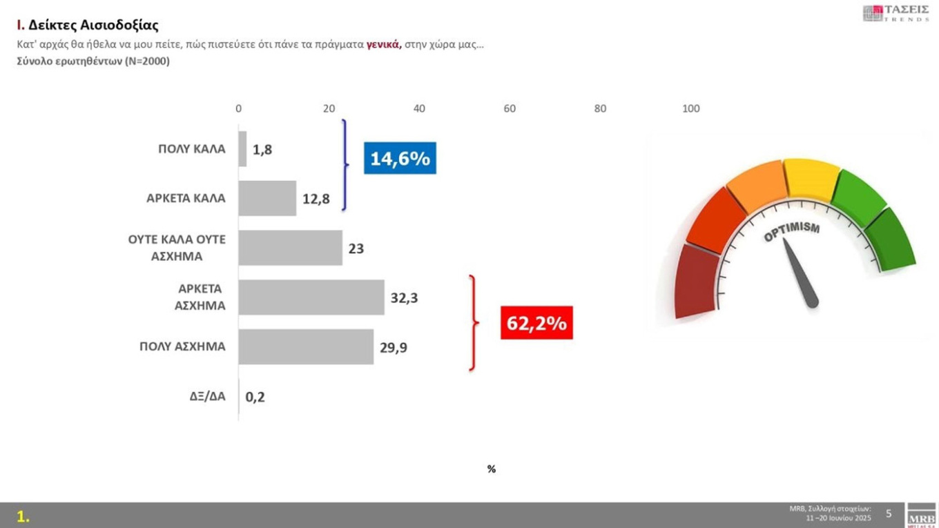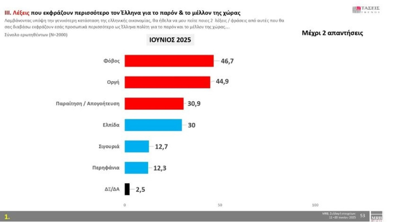Η μέτρηση περιγράφει μία κοινωνική ένταση, με κυρίαρχα συναισθήματα τον φόβο(46,7%) και την οργή(44,9%). Ωστόσο υπάρχει και ένα 30% που αναφέρει την ελπίδα ως κυρίαρχο συναίσθημα.