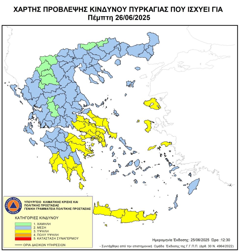 Υψηλός κίνδυνος πυρκαγιάς (κατηγορία κινδύνου 3) προβλέπεται για σήμερα Πέμπτη 26 Ιουνίου σε αρκετές περιοχές της χώρας, σύμφωνα με τον Χάρτη Πρόβλεψης Κινδύνου Πυρκαγιάς που εκδίδει η γενική γραμματεία Πολιτικής Προστασίας του υπουργείου Κλιματικής Κρίσης & Πολιτικής Προστασίας