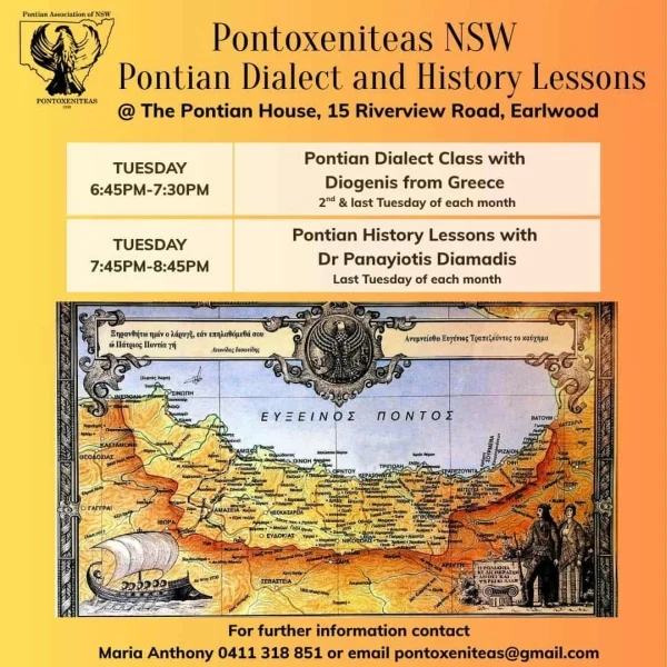 Η Ποντιακή Αδελφότητα Νέας Νότιας Ουαλίας «Ποντοξενιτέας», διοργανώνει για τα μέλη και τους φίλους του, μαθήματα ποντιακής διαλέκτου και ιστορίας του Πόντου με τον δρ. Παναγιώτη Διαμαντή και τον Διογένη Αϊνατζή.