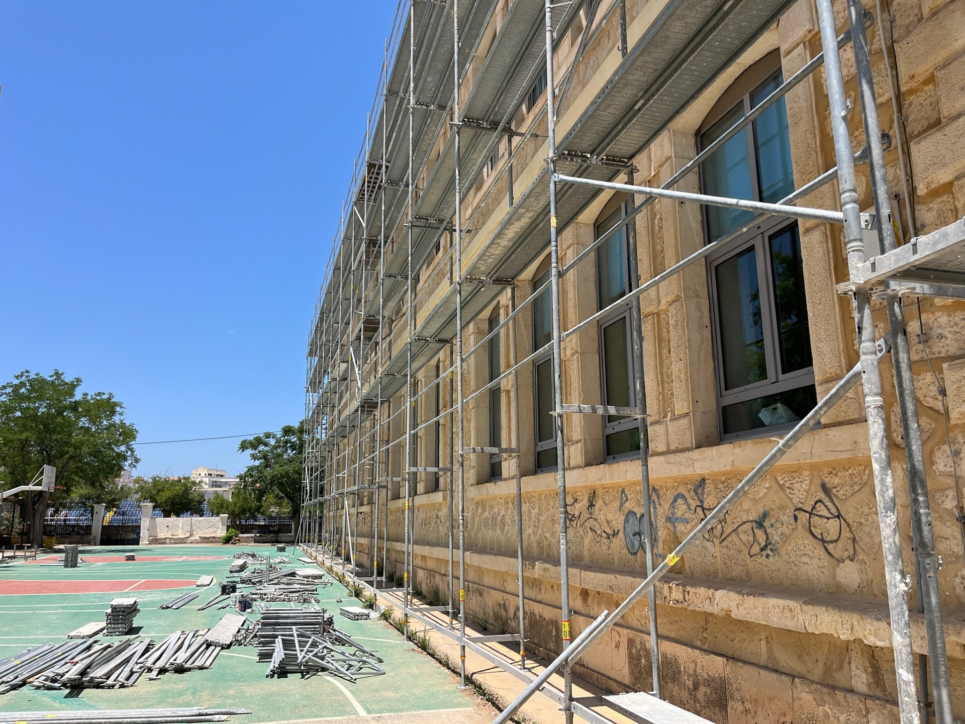 Στο 13ο Δημοτικό & Νηπιαγωγείο Χανίων στην Αμπεριά, γίνονται εργασίες πλήρους επισκευής-συντήρησης όλης της εξωτερικής όψης του σχολείου, που θα ολοκληρωθεί με το βάψιμο του κτηρίου.